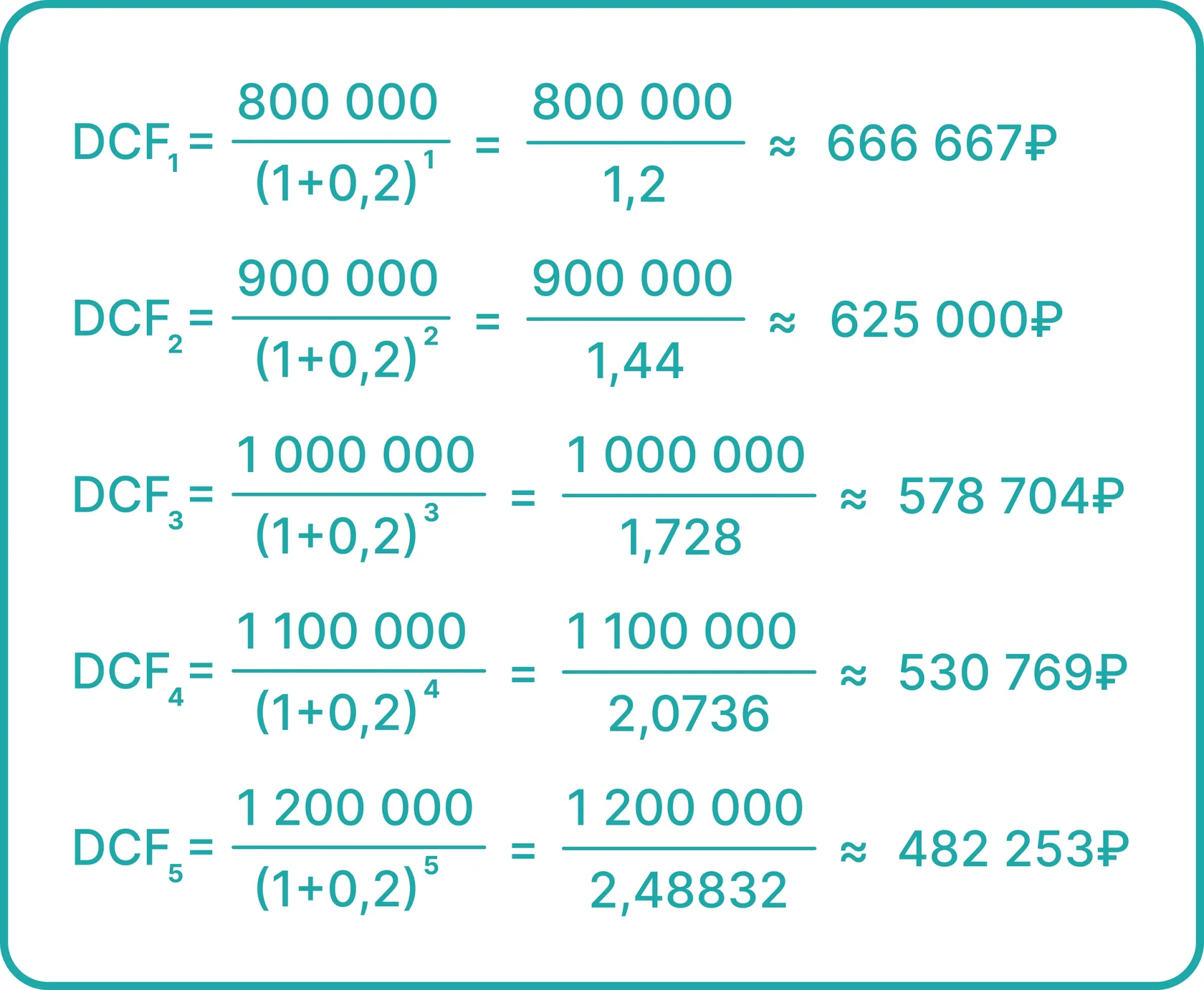 DCF = 666 667 + 625 000 + 578 704 + 530 769 + 482 253 ≈ 2 883 393 ₽