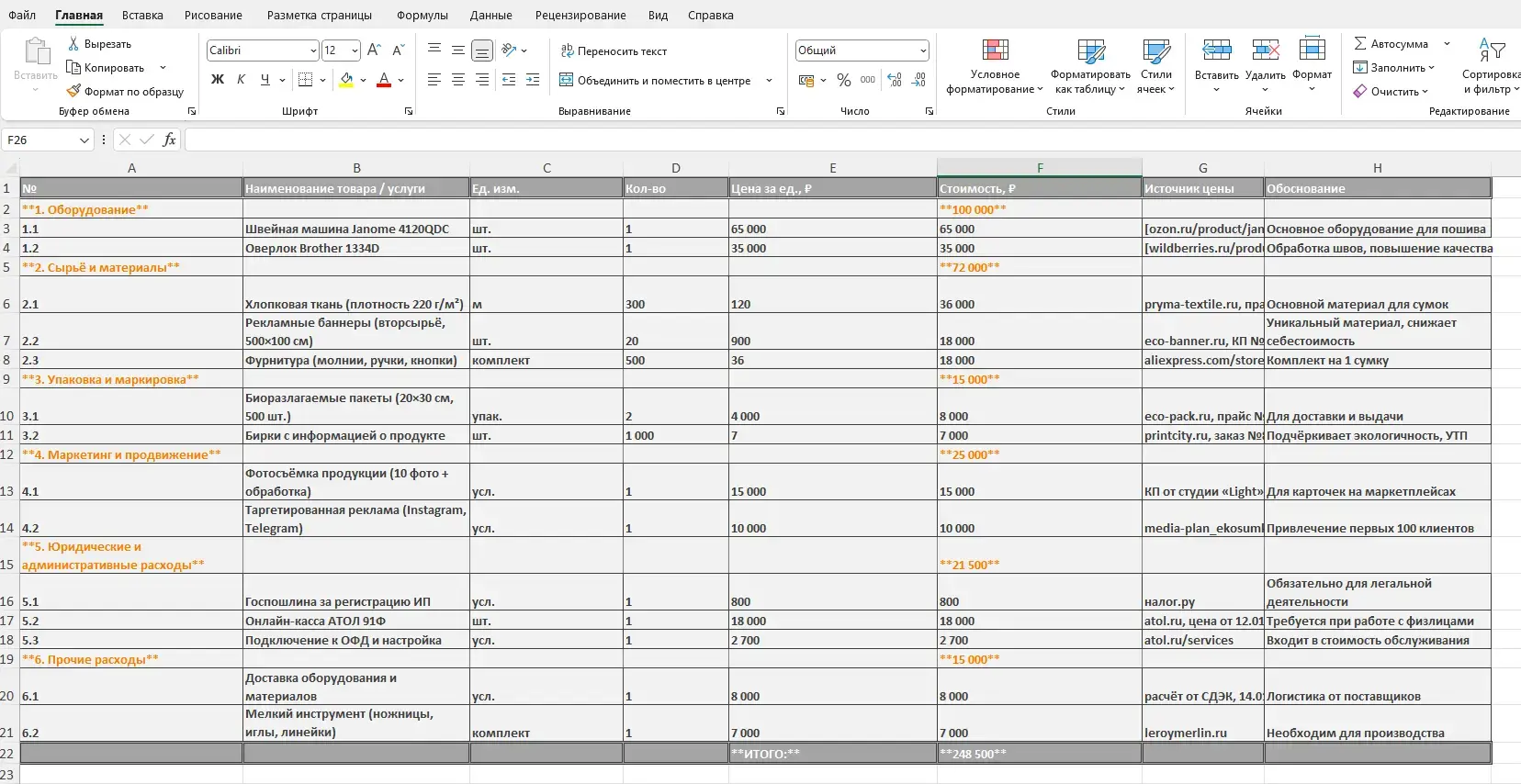 «Для запуска производства сумок из переработанной ткани требуется швейная машина Janome 4120QDC стоимостью 65 000 ₽ (см. смету, п. 1.1)».